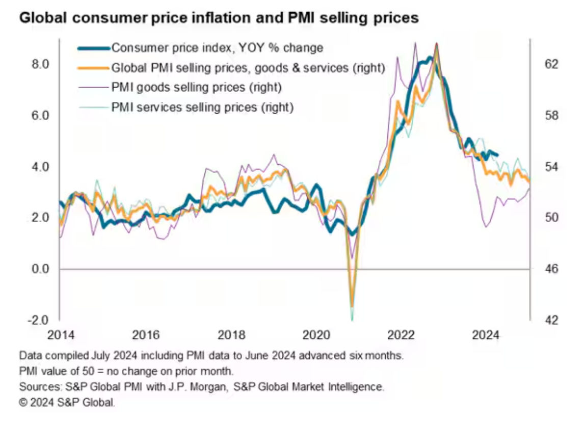 Price pressures remained elevated globally, according to PMI survey data, as further signs of cooling in the service sectors of most major economies were in part countered by reviving cost pressures in the manufacturing sector. The latter poses a potential threat to efforts to tame inflation, which in many economies remains elevated relative to central bank targets. Worldwide PMI survey data compiled by S&P Global for J.P. Morgan showed average prices charged for goods and services rose globally at the slowest rate since January, registering the second-weakest monthly rise since October 2020. The rate of increase nevertheless remained elevated by pre-pandemic standards, as slower service sector inflation was offset by resurgent price pressure in the manufacturing sector.