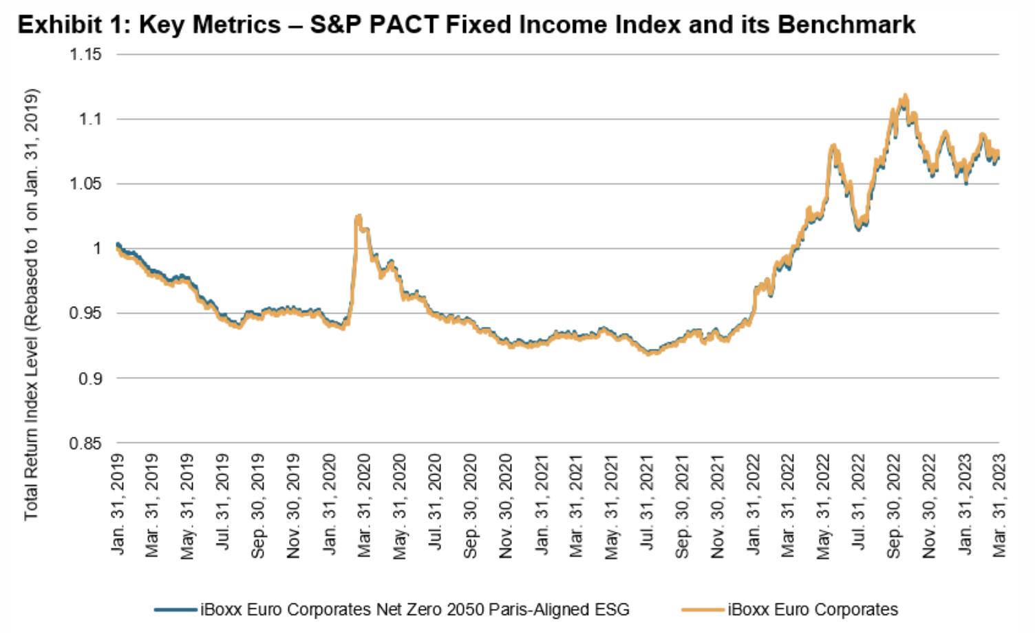 S&P DJI recently expanded its range of S&P PACT™ Indices (S&P Paris-Aligned & Climate Transition Indices) to go beyond equity to now cover fixed income. Within these indices, the differences between the two asset classes in terms of the balance between cost (tracking error) and reward (sustainability profile) are material and highly thought-provoking. As shown in S&P DJI’s Climate & ESG Index Dashboard, the equity S&P PACT Indices typically have an annualized tracking error ranging from 1.8% to 2.7% versus their market-cap-weighted benchmarks as of March 31, 2023. These levels of tracking error may be challenging for investors who are highly sensitive to any deviations in performance from a standard, market-cap-weighted benchmark.