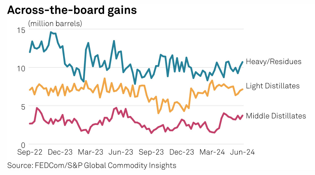 Stockpiles of oil products at the UAE's Port of Fujairah climbed to a six-week high as of June 3 amid signs of slow demand for fuel oil from the shipping sector and power plants, according to data from the Fujairah Oil Industry Zone and latest ship tracking data. Total inventories rose 5.9% to 21.573 million barrels in the week ended June 3, the highest since April 22, the FOIZ data published June 5 showed. Stockpiles have increased 24% since the end of 2023.
