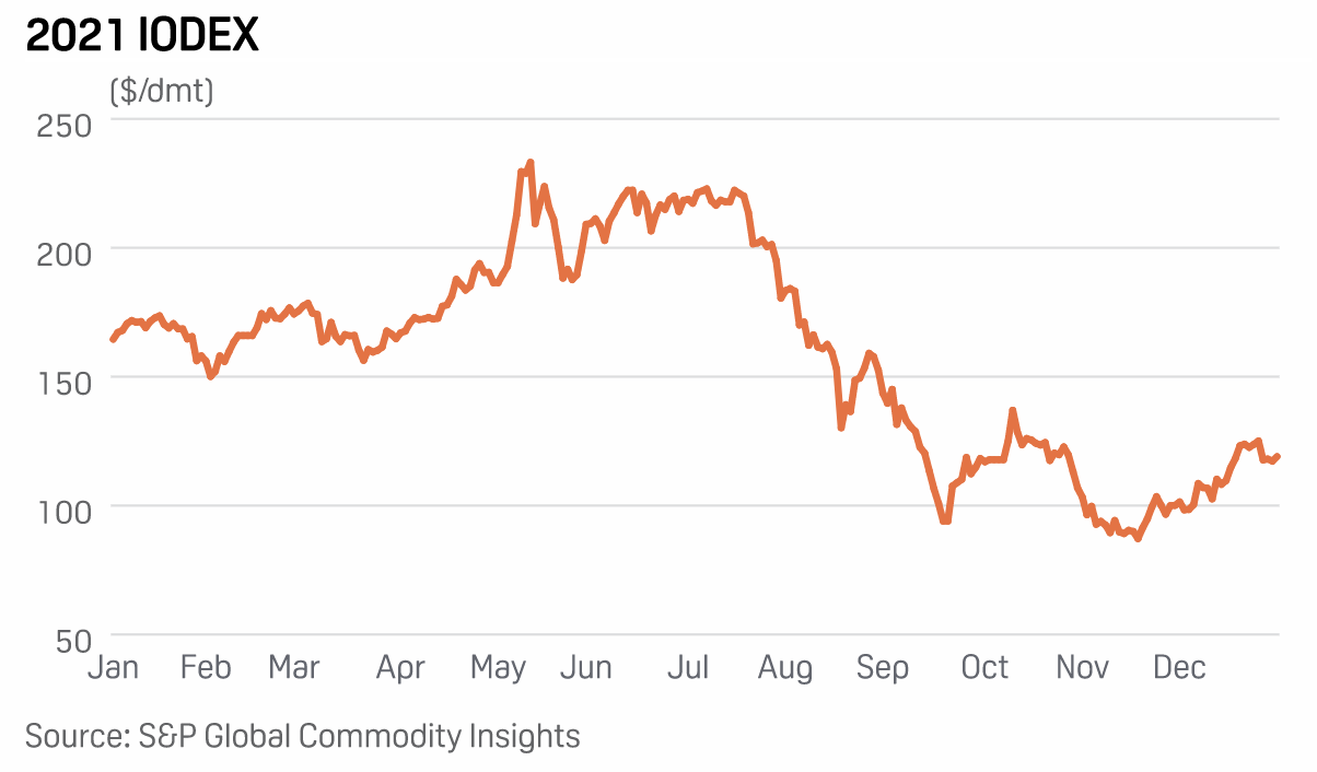 Volatility gripped the iron ore market last year. Huge price movements saw multi-year highs followed by steep falls as supply and demand whiplashed over the course of the months. S&P Global Commodity Insights' Platts 62% Fe IODEX started 2021 at $164.5/dmt Jan. 4 and rallied to $233.1/dmt, an all-time high May 12, before dropping 48.9% from the peak to close at $119/dmt on Dec. 31. S&P Global Commodity Insights unpacks the key trends that emerged in the iron ore market, including much-needed data on topics including brand-level market liquidity, price assessment participation, and pricing mechanisms.