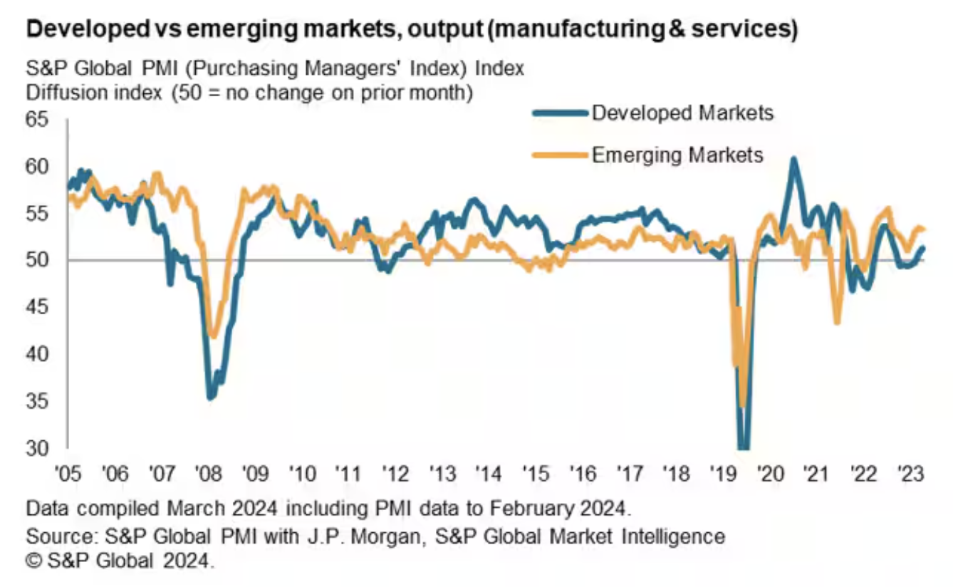 Emerging markets continued to expand at a solid pace midway into the first quarter of 2024, supported by broad-based expansion across both manufacturing and service sectors. India remained the brightest spot in the emerging market space, though major emerging economies such as Brazil, mainland China and Russia all recorded growth as well.