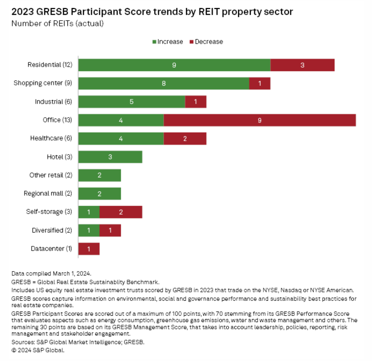 The 2023 Global Real Estate Sustainability Benchmark scores, or GRESB scores, showed an improvement in ESG efforts for the majority of scored US equity real estate investment trusts. GRESB scores capture information on ESG performance and sustainability best practices for real estate companies, covering more than 1,800 property companies, REITs, funds and property developers worldwide.