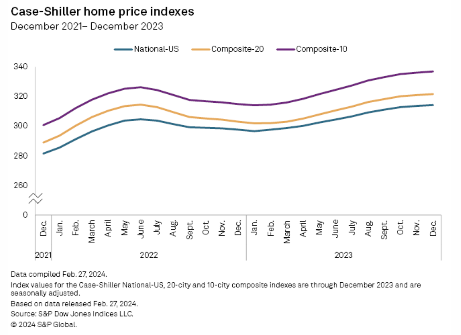 US home prices swung higher in December 2023, with the national index reaching a one-year high in annual gains. The S&P CoreLogic Case-Shiller US National Home Price NSA Index, covering all nine US census divisions, increased 5.5% year over year in December 2023, up from a 5% annual gain in the previous month. The yearly increase was the highest since the 5.7% year-over-year change recorded in December 2022.