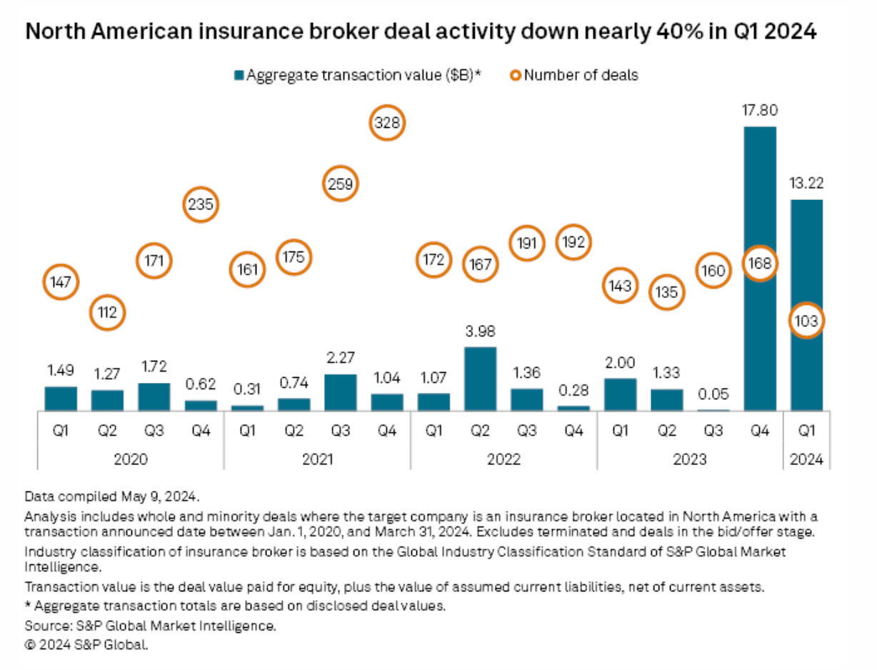 M&A activity involving North American insurance brokers declined nearly 40% in the first quarter of the year compared to the last quarter of 2023, according to an S&P Global Market Intelligence analysis. There were 103 deals with an aggregate value of $13.22 billion targeting insurance brokers during the first quarter, down from 168 deals and an aggregate value of $17.80 billion in the preceding quarter.