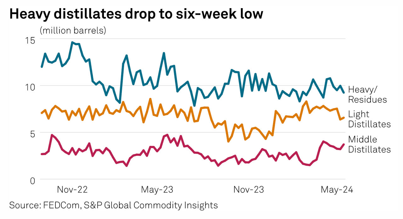 Stockpiles of oil products at the UAE's Port of Fujairah dropped for a fifth consecutive week, the longest losing streak since 2020, as shipments of fuel oil used for bunkers and for power generation increased ahead of summer and peak demand for air conditioning in the Middle East, according to the Fujairah Oil Industry Zone and ship tracking data.