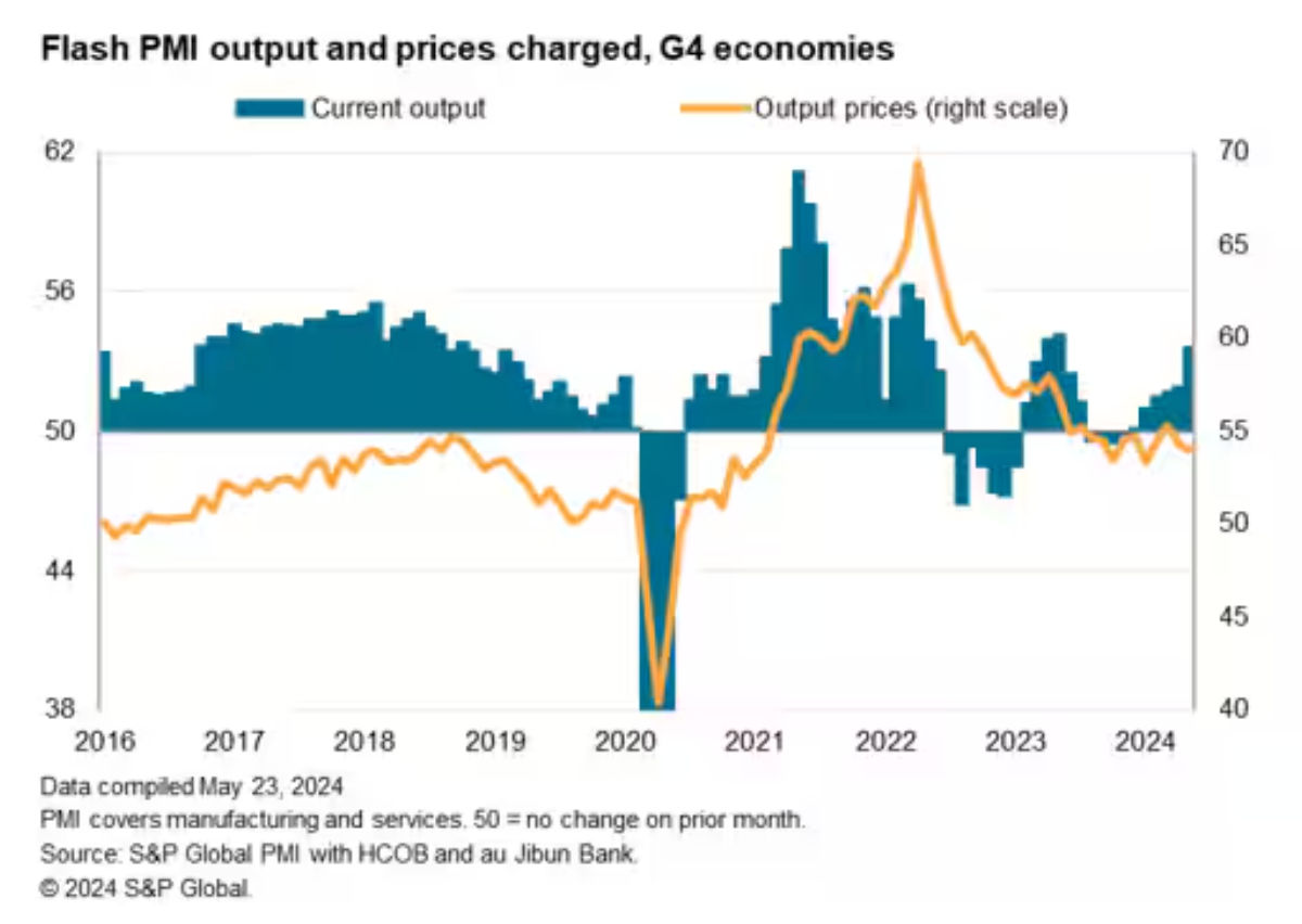The flash PMI data for May from S&P Global brought encouraging news on economic growth, with output of the combined manufacturing and service sectors rising across the four major developed economies — the “G4” — at the fastest rate for a year. Inflation pressures meanwhile eased, down to one of the lowest levels for over three years. The rate of inflation signaled nevertheless remained stubbornly by pre-pandemic standards, having been stuck in a narrow but elevated range over the past year. There were, however, some notable variations in the growth, and most importantly, the inflation trends among the four economies.