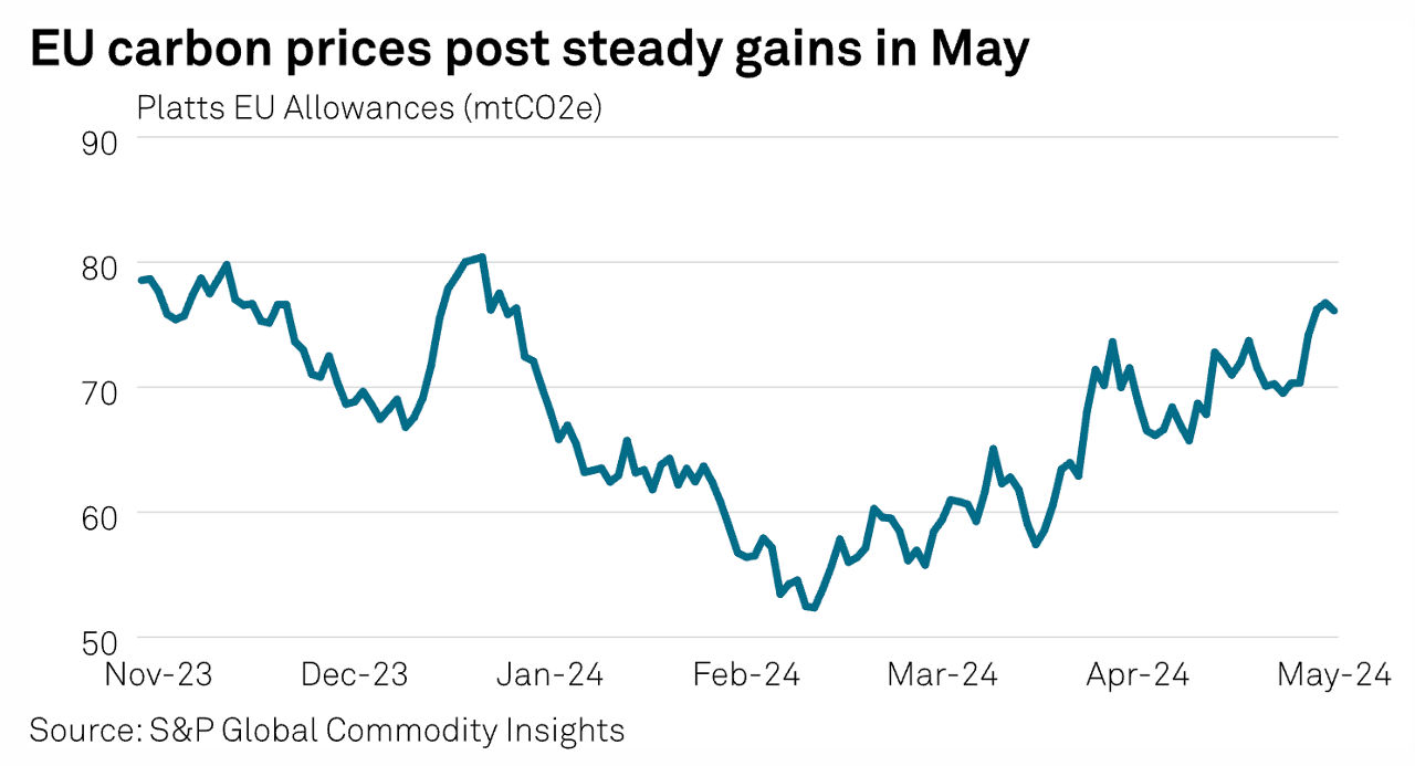 European carbon prices rose sharply in the week to May 24, supported by a rallying gas complex and better demand from the industrial sector. EU Allowances rose almost Eur7/mtCO2e ($8/mtCO2e) to almost Eur77/mtCO2e at one stage but fell to near Eur75/mtCO2e on May 24 on weaker auction results. EUAs were trading at Eur74.49/mtCO2e late in the morning, ICE data showed.