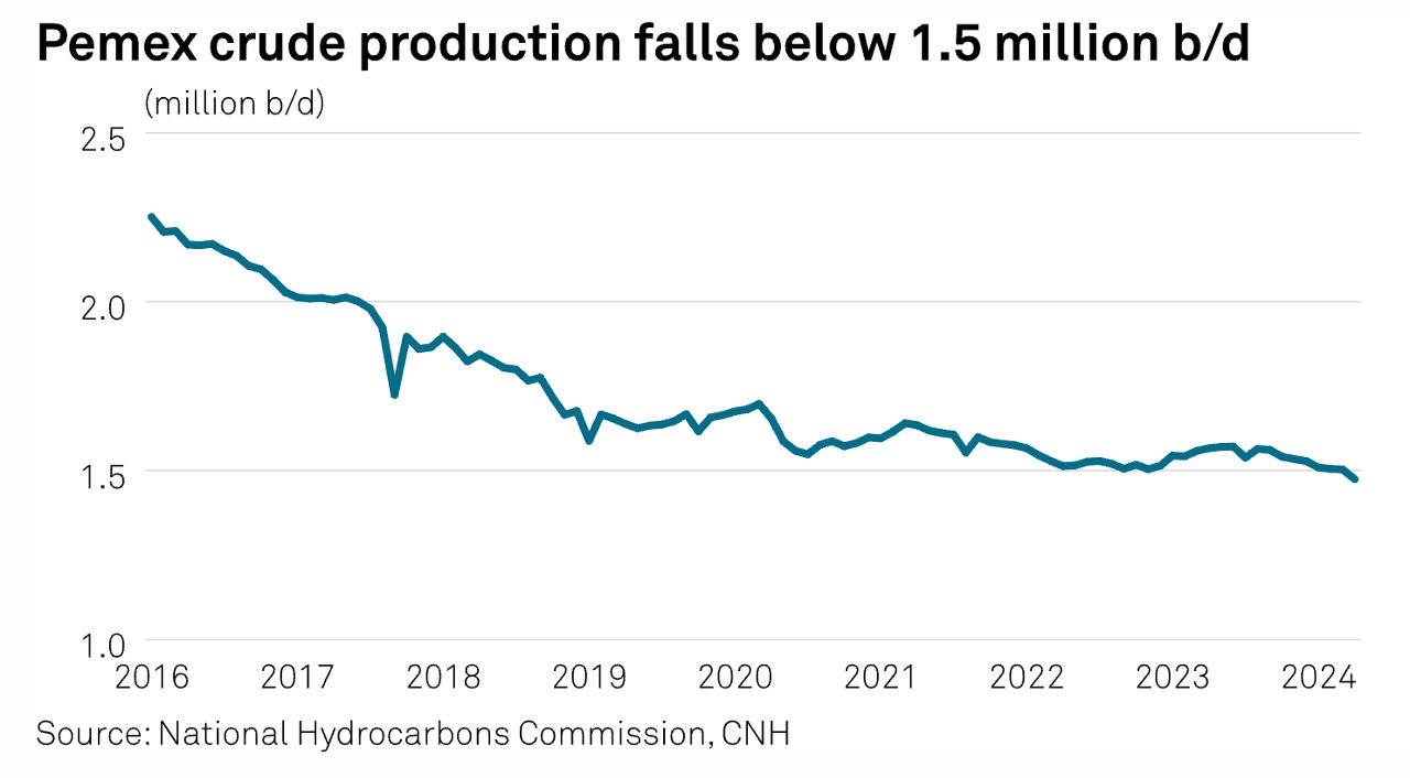Crude production by Mexico's state-owned oil and gas company Pemex fell below 1.5 million b/d in April, data from the national upstream regulator showed May 23. The figure, the lowest in over 40 years, shows how the output from the new fields developed in the current administration has not been enough to compensate for the decline of older, larger legacy fields which were once the bedrock of the Mexican petroleum industry.