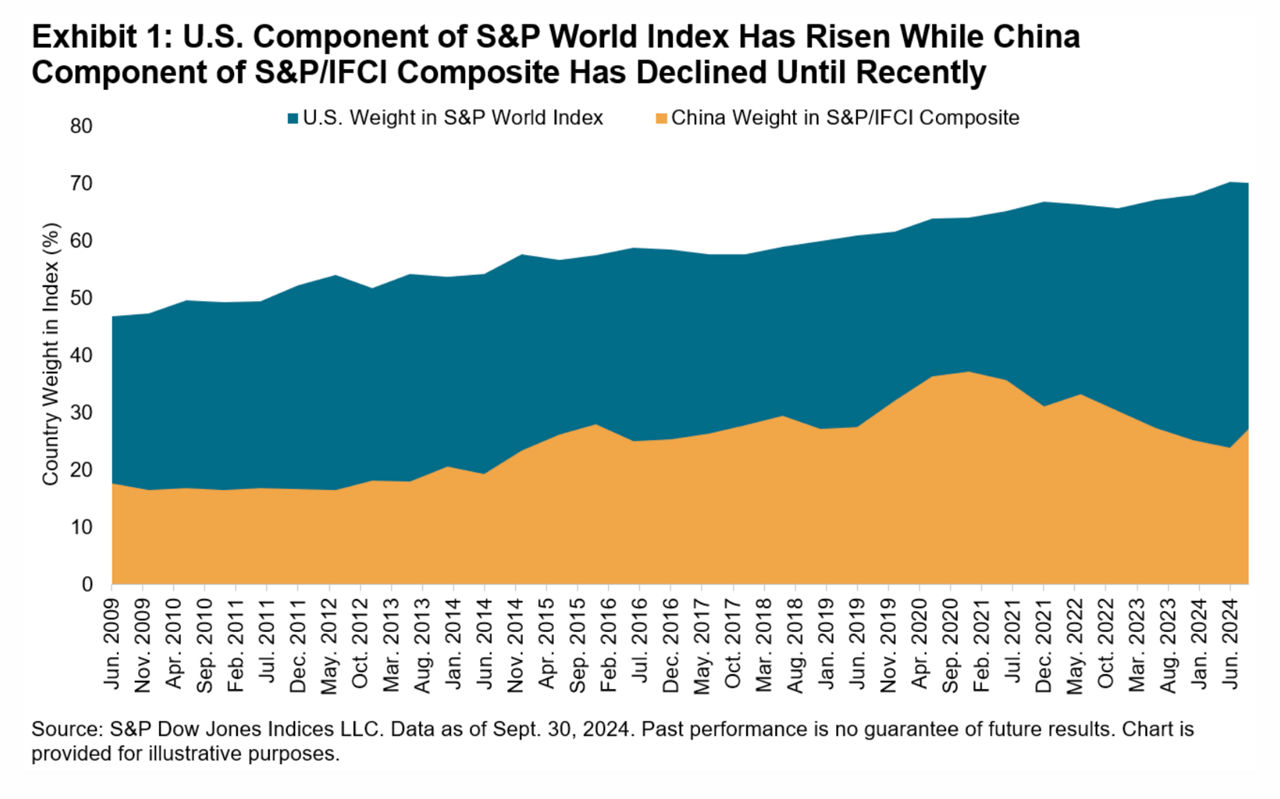 Much of recent market commentary has been focused on market concentration concerns, thanks to the dominance of mega-cap stocks in the US, with the S&P 500® Top 50 outperforming the S&P 500 by 5% for the 12 months ending in September 2024. But as we’ve noted in our inaugural SPIVA® Global Mid-Year 2024 Scorecard, concentration trends can manifest at a broader level than individual securities, and more specifically at a country level.