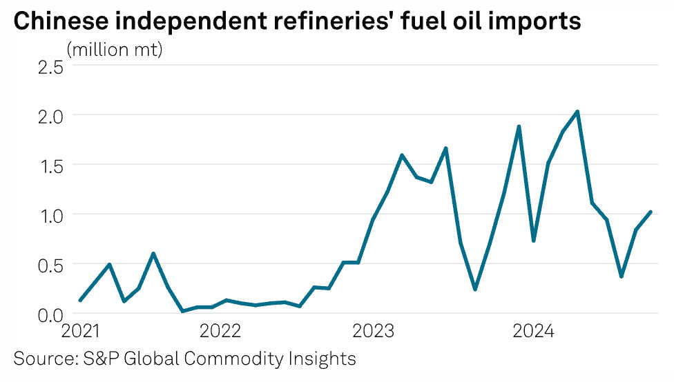 China's independent refineries, mostly in eastern Shandong province, cut their fuel oil feedstock procurement in October as the new tax deduction regulations will be effective soon, refinery and trade sources told S&P Global Commodity Insights Oct. 14. "Some refiners are still buying fuel oil as they don't have crude import quotas, there is no other choice for them," said an independent refinery source, adding that the volume is set to fall from September.