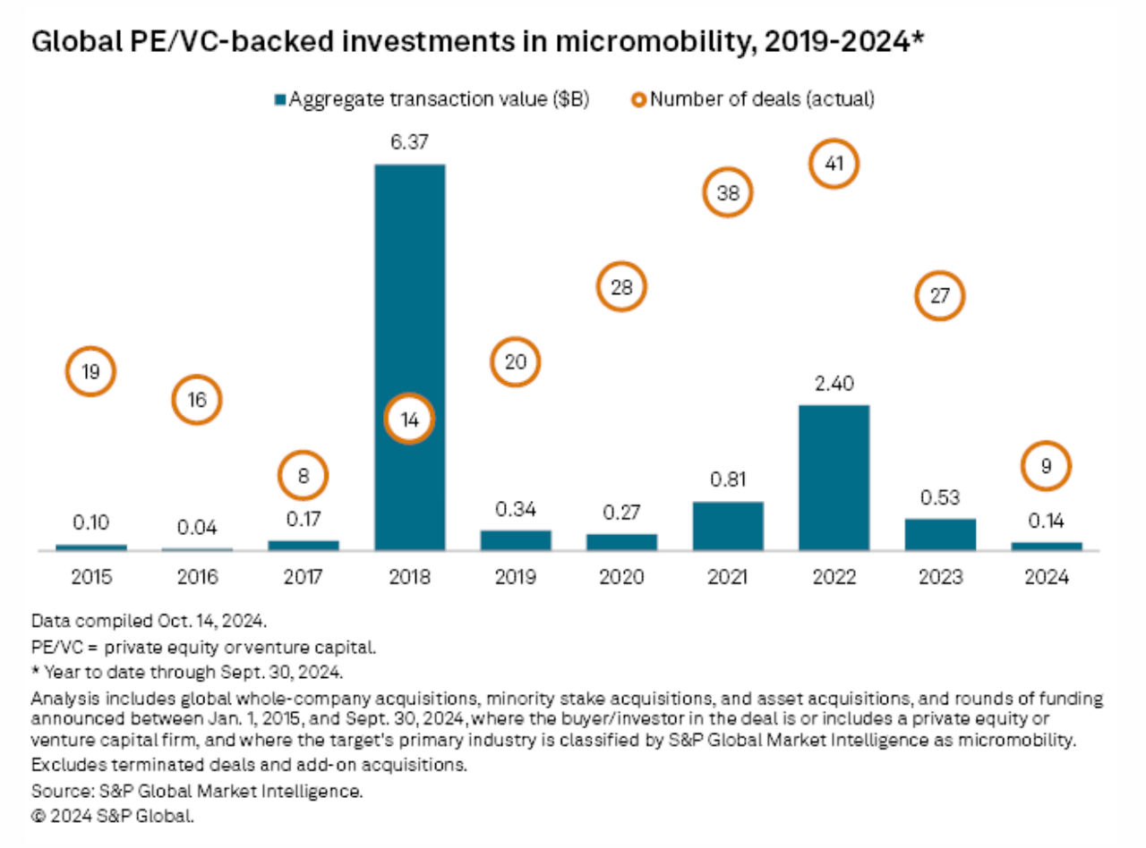 The value of global private equity and venture capital transactions in the micromobility sector is on track to drop for a second consecutive year in 2024 as investors demand companies prioritize profitability over growth. Micromobility refers to lightweight vehicles usually used for short distances such as bicycles, scooters, motorized cycles and mopeds. In the first nine months of 2024, the global micromobility sector raised $142.9 million from private equity-backed deals, just 26.9% of the $531.6 million secured in all of 2023.