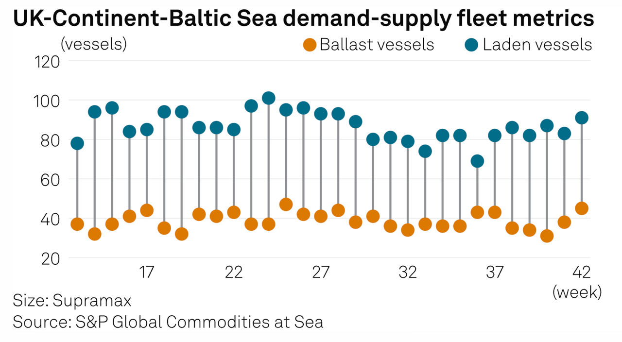 The Supramax segment in the Continent and Baltic Sea regions endured a trading week that remained weak, mainly caused by fewer cargoes, which led to subdued levels for the week of Oct. 14-18. The market experienced sluggish activity for the week, and prices seemed to decrease. However, there was a spike, making prices firmer midweek, but they mostly fell Oct. 18.