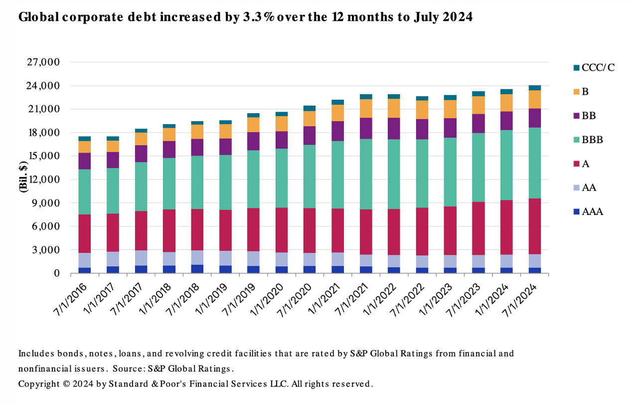 Strong issuance has supported the growth of global rated corporate debt outstanding — it reached $23.98 trillion as of July 1, 2024, up 3.3% ($776 billion) over the past 12 months. Investment-grade, which increased by 4.0% ($718 billion), primarily drove the growth, while speculative-grade debt increased by 1.1% ($58 billion).