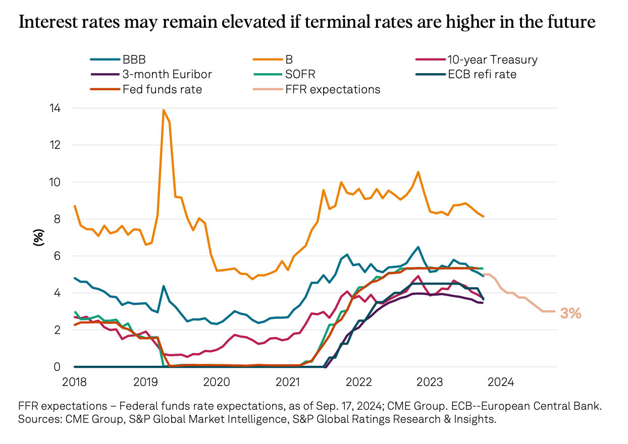 Despite geopolitical risks increasing and rates remaining high through most of this year, credit remains resilient. Refinancing activity has been strong across most ratings and sectors. Upgrades continue to outpace downgrades, and defaults have started to moderate in recent months. S&P Global Ratings expects the default rate to fall, but at a slower pace than it rose due to residual strain for the lowest-rated borrowers.