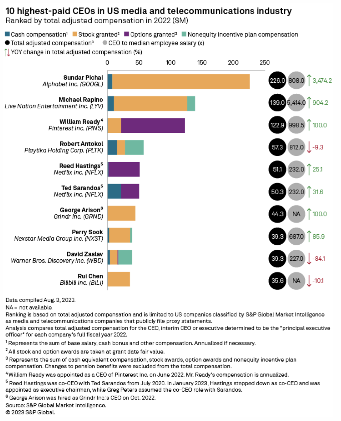 Alphabet Inc. CEO Sundar Pichai outearned his peers in the US media and telecom industries in 2022 after receiving sizable stock awards, according to S&P Global Market Intelligence data. Pichai received almost $226.0 million in total adjusted compensation in 2022, up from roughly $6.3 million in 2021. Pichai's 2022 compensation comprised $7.9 million in cash pay, including a salary of $2.0 million, and $218.0 million in stock awards.