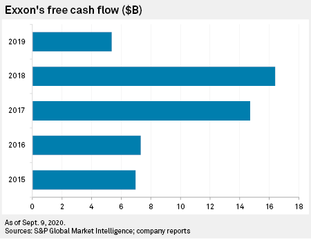 Looking for ways to bolster its bottom line in the aftermath of the pandemic-fueled oil price crash, Exxon Mobil Corp. must do more to rein in its massive spending program, which could include slashing the dividend in 2021 if petroleum demand continues to wallow and oil prices hold near $40 per barrel, analysts said. "The company cannot continue to fund its large cash-flow deficit for years to come without starting to compromise the strength of its balance sheet. A recovery in oil prices and the company's end-markets and/or a large reduction in capital spending is needed to support its balance sheet over time," Edward Jones analyst Jennifer Rowland said in a Sept. 8 email.