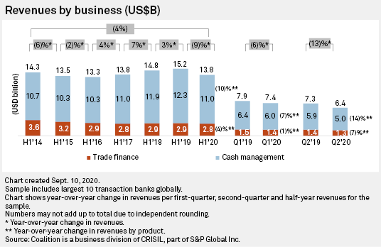 The revenue decline at the world's 10 largest transaction banks accelerated in the second quarter amid interest rate cuts and the continuing deterioration in global economic activity due to the COVID-19 pandemic, research company Coalition said in its latest sector index. Total transaction banking revenues fell 13% year over year to $6.4 billion in the second quarter, more than double the 6% decline in the first quarter. Over the first half, transaction banking revenues fell 9% year over year to $13.8 billion. This was the first drop after three consecutive years of growth, Coalition said.