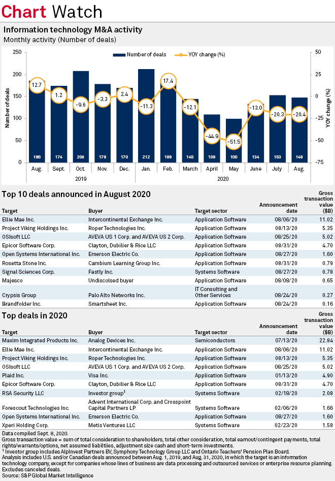 Information technology M&A deal volume was depressed again in August, but it was definitively a month of recovery. There were 20.4% fewer deals announced in the sector in August compared to the same month in the prior year. However, August 2019 was a tough comparison, up 12.7% over the prior year, and the current-year month saw the sector's second-largest deal announcement of the year—Thoma Bravo LLC's sale of Ellie Mae Inc. to Intercontinental Exchange, Inc. for $11.02 billion.