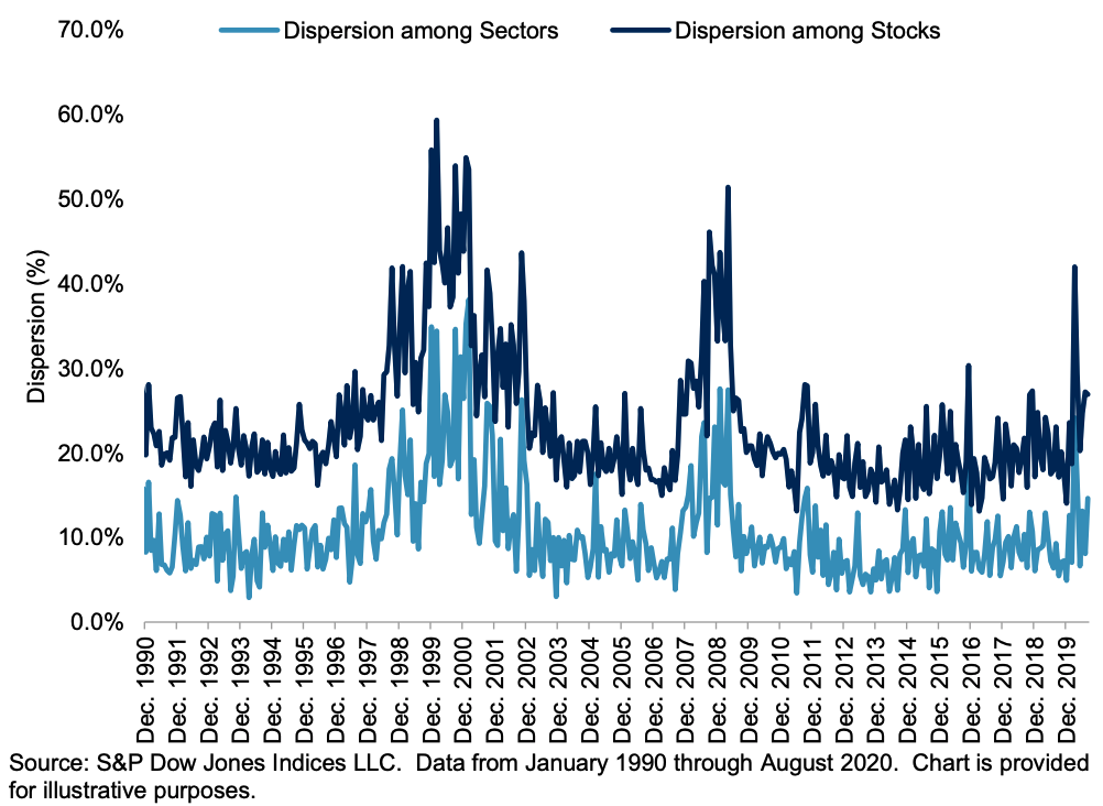 The value of stock selection skill rises when dispersion is high; a larger gap between winners and losers means that active equity managers have a better chance to display their selection abilities. This logic also applies to active managers operating at a higher level of aggregation, for example by expressing tactical market views through sector rotation. The importance of sectors tends to be greater than average during the Novembers when U.S. federal (and especially presidential) elections take place.