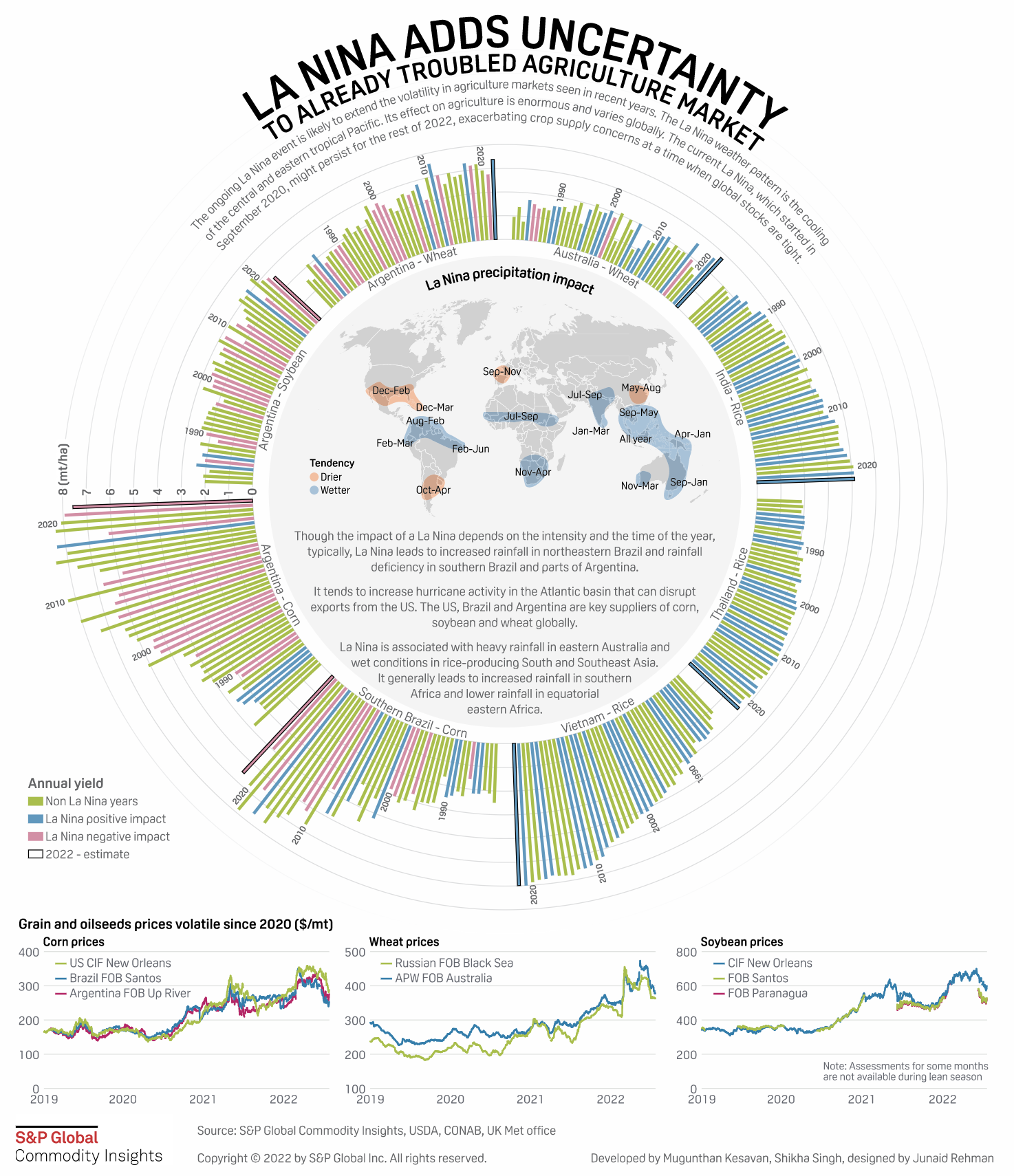 The ongoing La Nina climate phenomenon may extend into its third year in a rare event to become what is called a triple-dip La Nina. This is likely to extend the uncertainty currently prevailing across agriculture markets as supply estimates for various food commodities faltered this year, largely driven by weather adversities in top producing countries. Prices of wheat, corn and soybeans have remained volatile with an upward edge. Weather, although not the only factor, has been a major driver of these volatilities.