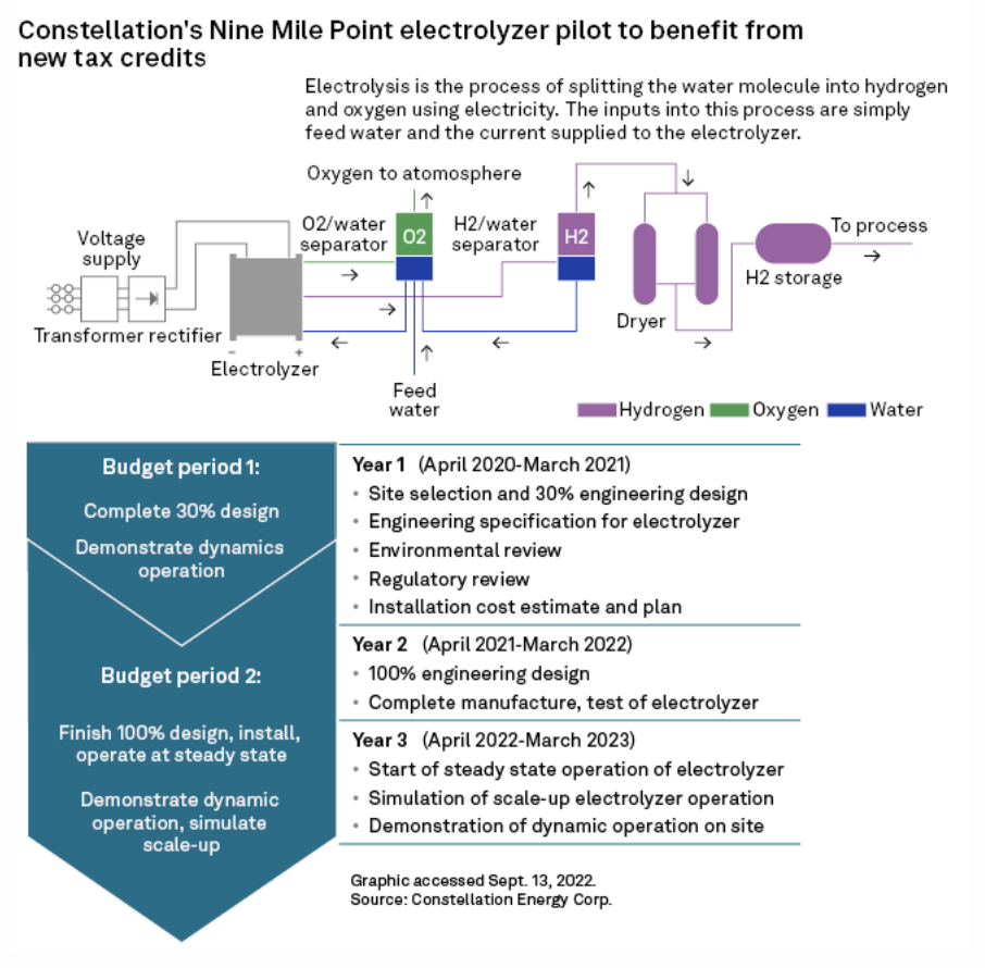 Nuclear plant owners already looking at a tax credit in the recently passed U.S. federal climate package derive additional benefits by supplying electricity to hydrogen producers, according to industry analysts. Constellation Energy Corp., with a nuclear generation fleet of more than 21,600 MW, in particular, would benefit from unlocking "new potential opportunities for merchant nuclear plants and attractive returns for hydrogen facilities," Morgan Stanley told clients in a Sept. 12 report.