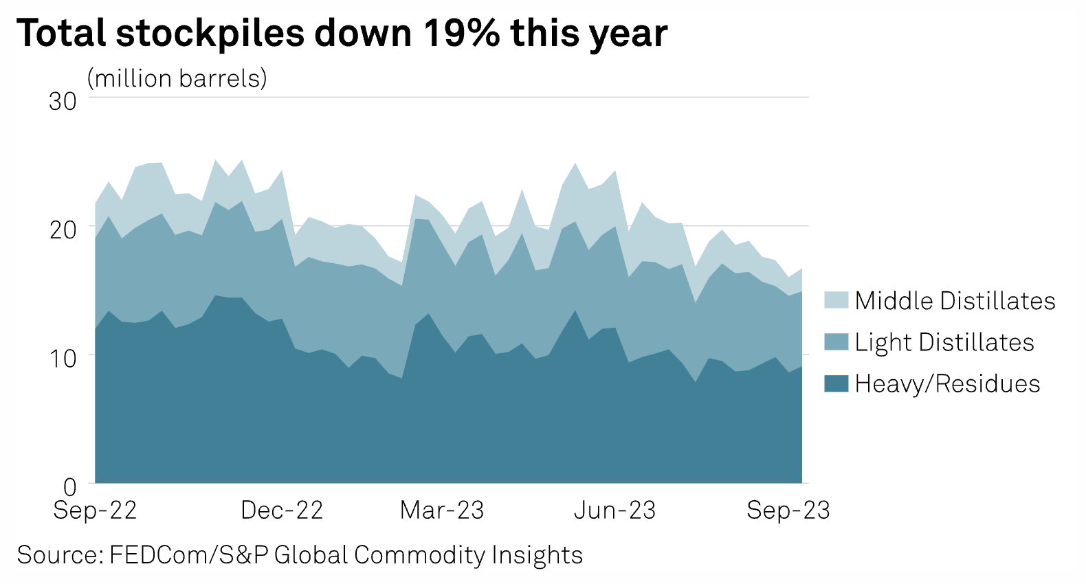 Stockpiles of oil products at the UAE's Port of Fujairah climbed 4.5% in the week ended Sept. 11, the first increase in four weeks from a 17-month low a week earlier, according to latest data from the Fujairah Oil Industry Zone. Total inventories rose to 16.717 million barrels as of Sept. 11, after falling to its lowest since April 2022 on Sept. 4, the FOIZ data provided exclusively on Sept. 13 to S&P Global Commodity Insights showed. The total stockpile dropped 15% in the previous four weeks and was down 19% since the end of 2022.