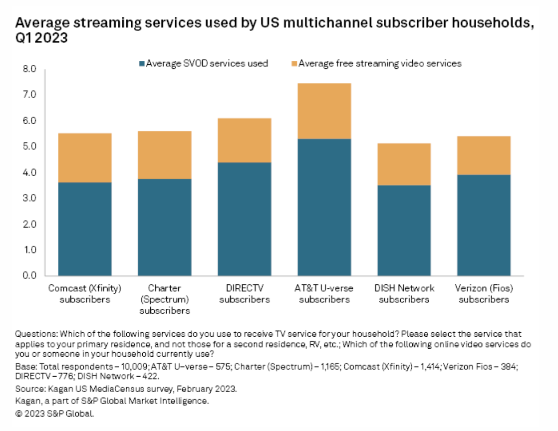 While the rise of streaming alternatives has played a key role in the wave of cord cutting roiling the traditional multichannel TV industry in the US, pay TV households tend to be heavy users of subscription video-on-demand services as well as free video streaming offerings. As traditional TV network owners Comcast Corp., Walt Disney Co., Paramount Global and Warner Bros. Discovery Inc. shift programming to streaming services such as Peacock, Disney+, ESPN+, Hulu, Max, Peacock, Paramount+, Max and Discovery+, some pay TV households may effectively be "paying twice" for the same programming depending on pay TV package, what streaming services households subscribe to and what programming they typically view.