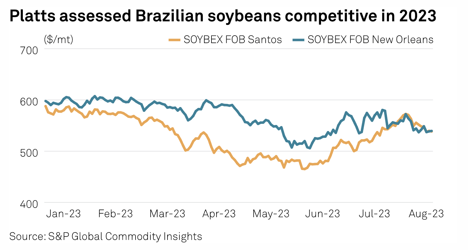 The US soybeans production forecast in marketing year 2023-24 (September-August) has been sliced significantly since pre-season estimates amid sizable acreage cut and prolonged unfavorable weather, likely supporting Brazil's oilseed exports early next year, analysts and market observers have told S&P Global Commodity Insights. Just before the oilseed sowing for MY 2023-24 began mid-May, the US soybean production was forecast at record 122.74 million mt with a yield of 52 bushels/acre, up 5% on the year and acreage estimates of 87.5 million acres, steady on the year, the US Department of Agriculture's May 12 World Agricultural Supply and Demand Estimates report showed.