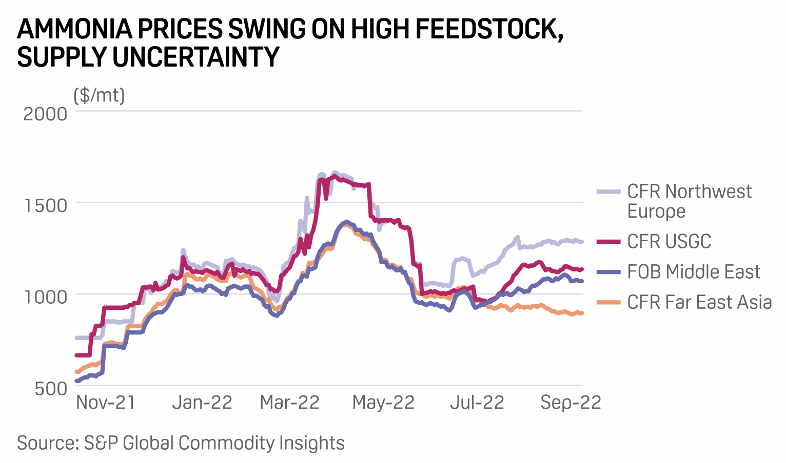 The surge in natural gas feedstocks costs in Europe in mid-2021 and the ongoing war between Russia and Ukraine boosted global ammonia spot prices to historic highs in April. For most of 2022, prices have been triple or quadruple the levels seen between 2016 and 2020. The abrupt stop of Russian and Ukrainian ammonia shipments out of the Black Sea after the Russian invasion of Ukraine in February slashed global supplies.