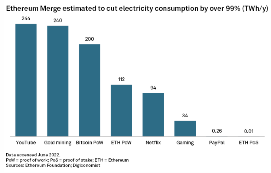Ethereum, the world's second-largest cryptocurrency protocol by market capitalization, virtually eliminated its energy consumption overnight on Sept. 15 by successfully transitioning to a new consensus mechanism known as proof of stake. Although the long-awaited change did not result in a sudden price action for ether, the protocol's native crypto-asset, industry experts expect the shift to gradually alleviate concerns about how the use of blockchain technology is impacting the environment and demand for energy.