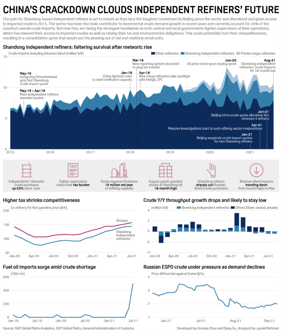 Recent measures by Beijing to tighten supervision of the independent refining sector have clipped the wings of the largest contributors to China's crude import growth since 2016 and are expected to alter the country's refining landscape by forcing shutdowns and consolidations.