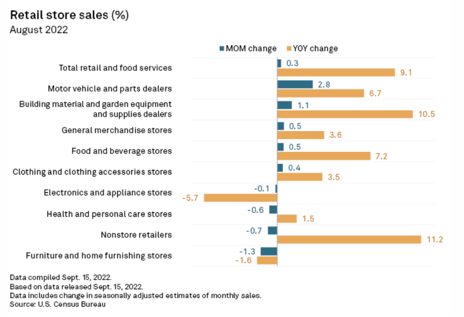 U.S. retail sales in August rose beyond expectations as shoppers showed resilience in the face of high inflation. Retail and food services rose 0.3% month over month in August, according to U.S. Census Bureau data released Sept. 15. Economists expected the figure to be flat, according to the consensus estimate compiled by Econoday.