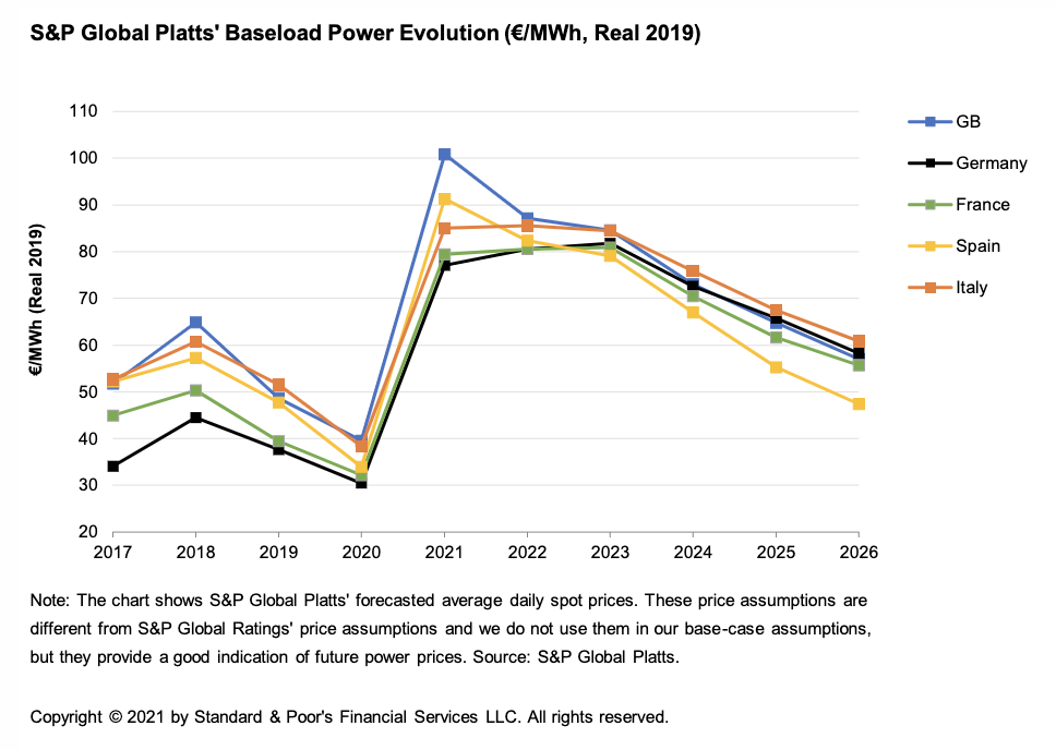 European power prices showed a stronger-than-anticipated rebound in 2021. This follows a drop of more than 20% drop in 2020 amid COVID-19 lockdowns and weaker economy; the improvement stemmed mainly from a surge in gas prices and to a lesser extent carbon prices, which reach a record high of close to €60 per ton.