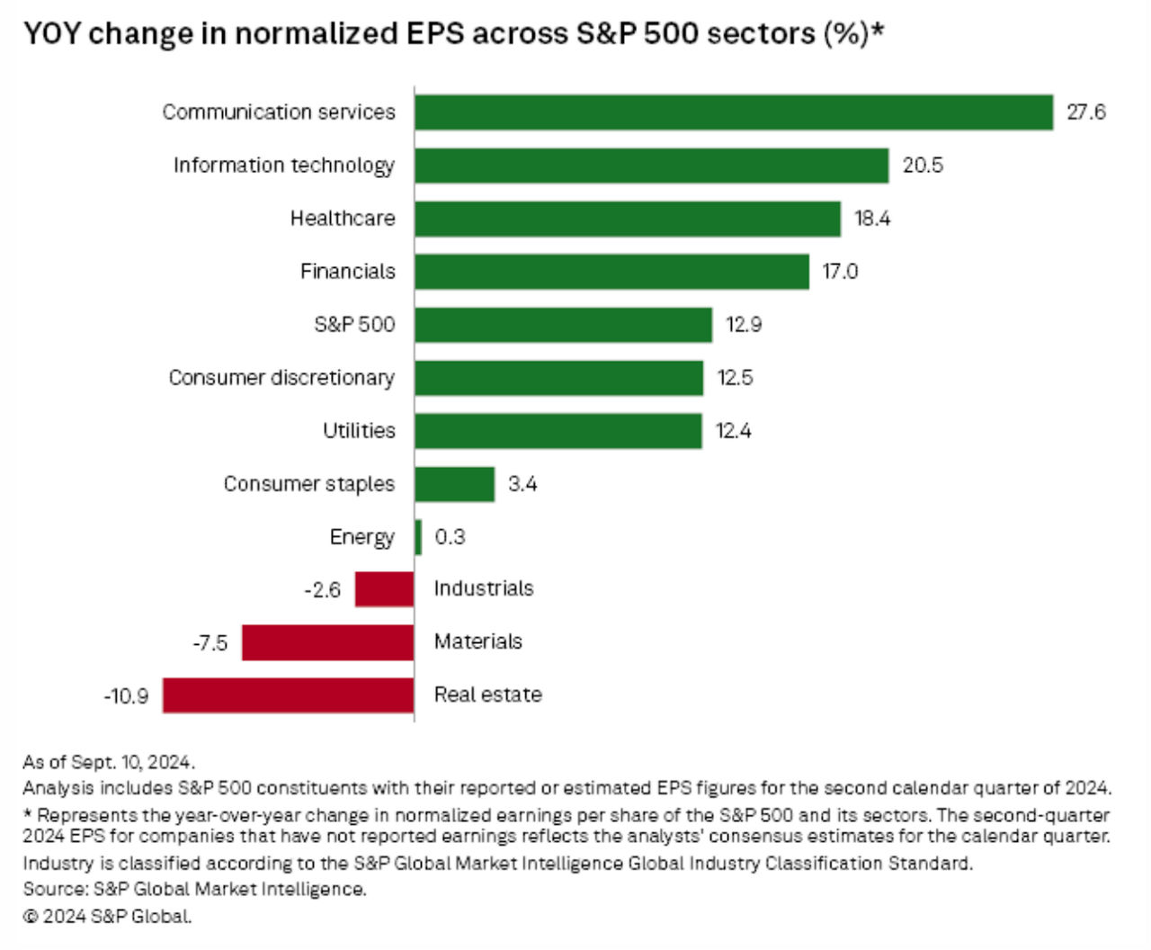 Combined second-quarter normalized earnings per share for the S&P 500 rose nearly 13% year over year as most of the large-cap index's constituent sectors also reported earnings growth, according to the latest S&P Global Market Intelligence data. As of Sept. 10, all S&P 500 sectors except industrials, materials and real estate reported earnings growth. The communication services sector reported the largest EPS growth among sectors.