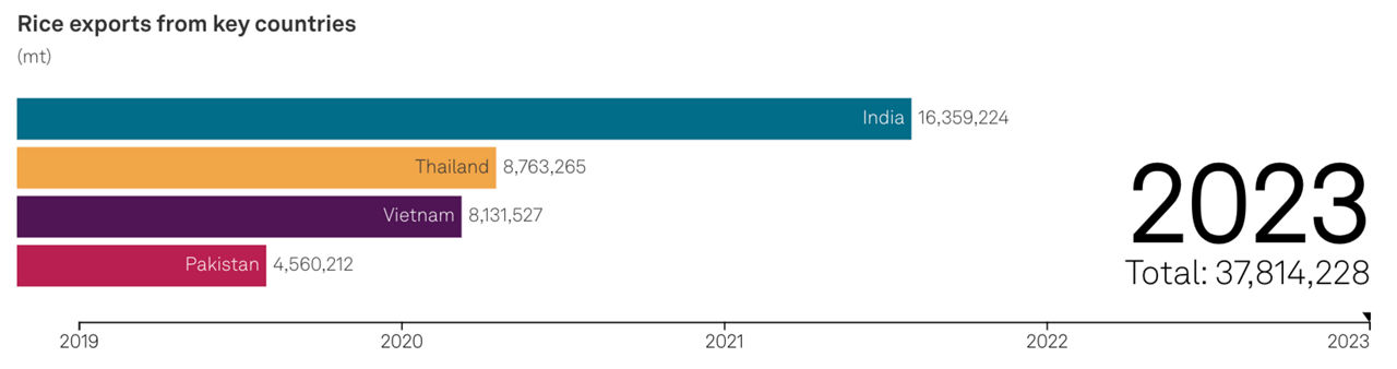 India imposed certain export restrictions on rice in August 2022 and followed it up with another set of bans in July 2023. Such policies from the world’s largest rice exporter have proved to be a boon for regional peers. Thailand, Vietnam and Pakistan all posted significant gains in rice shipments, leading to a notable shift in regional trade flows.