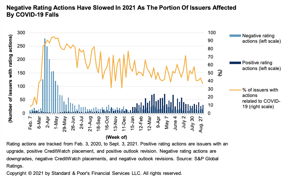 The number of rating actions increased in August and through Sept. 3, with positive rating actions far outpacing negative ones. The downgrade ratio (downgrades as a percentage of total rating actions) declined further in August 2021, as there were only 26 downgrades compared with 53 upgrades. So far in 2021, there have been 474 issuers that have had a negative rating action and 1,352 issuers with a positive rating action.