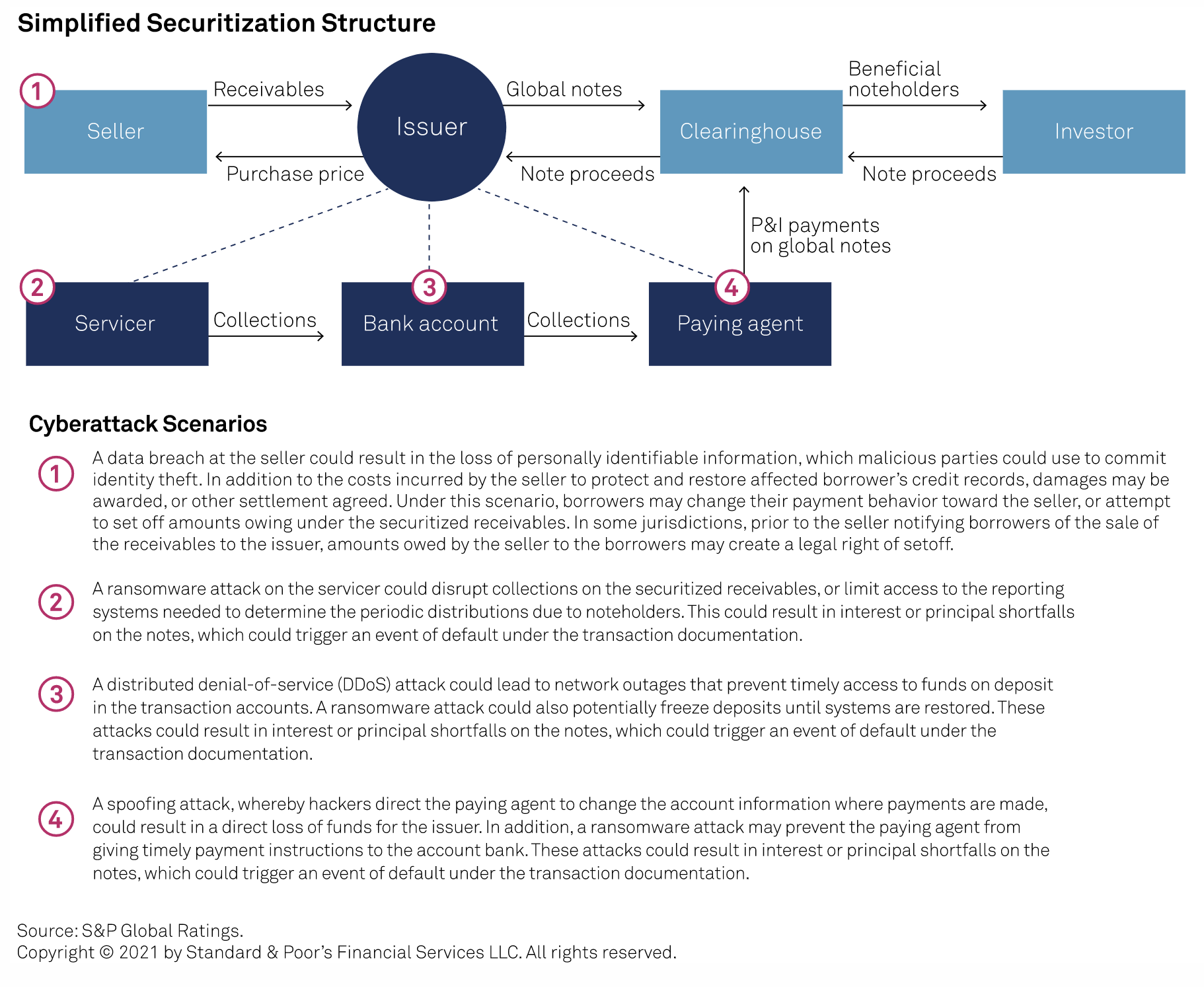 In S&P Global Ratings’ view, securitizations have lower direct exposure to cyber events than non-special-purpose entities, such as corporates and financial institutions. However, the potential negative credit impact following a cyberattack could be more pronounced given the limited resources available to securitizations. Many of the structural features already in place to ensure operational continuity in structured finance transactions have positive spill-over effects on cyber readiness. These include cash reserves to address liquidity risks, performance triggers that may change the priority of payments, and replacement provisions for key transaction parties who may become materially affected by a cyber event.