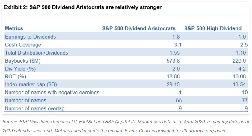 Exhibit 2 compares the median values of the 500 Dividend Aristocrats and the High Dividend Index on a number of fundamental metrics that measure the strength of companies making dividend payouts.