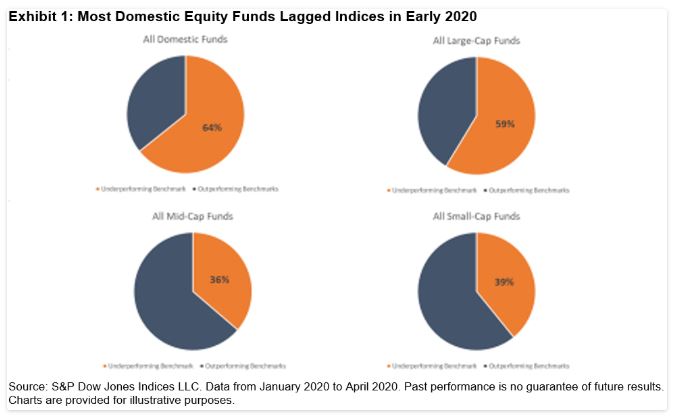 This data is in line with the period we examined in the webinar. During the initial stages of the COVID-19 crisis, we saw huge swings in the market. Even though active managers had the ability to go to cash, almost two-thirds still got it wrong and underperformed (see the top left pie chart of Exhibit 1).