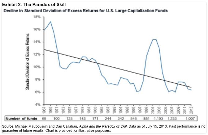 Every year, I hear on CNBC that this is a stock picker’s year, but it has never been a stock picker’s year when you adjust for risk appropriately over time. Exhibit 2 shows the rolling five-year standard deviation of excess returns of U.S. large-cap mutual funds over the past five decades. You should expect to see wide dispersions when there are large differences in levels of skill. The trend of declining dispersion in excess returns fits with our narrative that the competition is getting tougher for active managers.