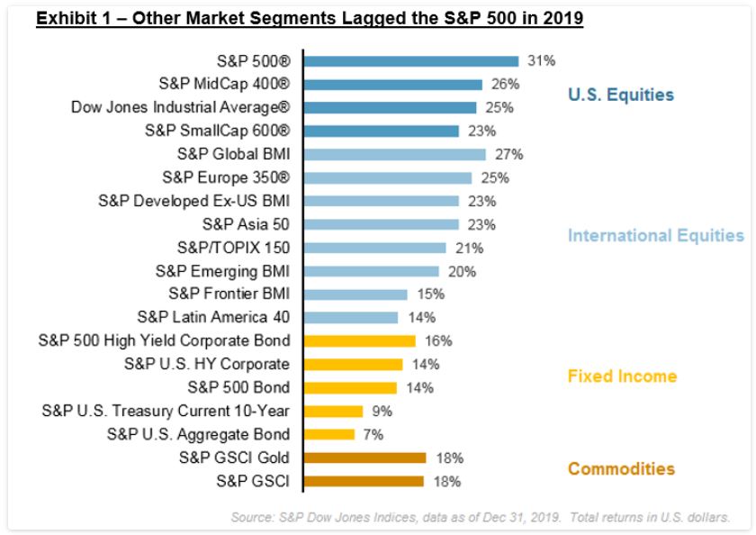 What does this mean for active equity managers? Early indications point to a rough year for stock pickers, with less than 1/3 of active U.S. equity managers estimated to have finished 2019 ahead of their benchmarks. Whatever else may be true of the coming year, active managers might at least hope that the S&P 500 goes back to being just “hard” to beat.