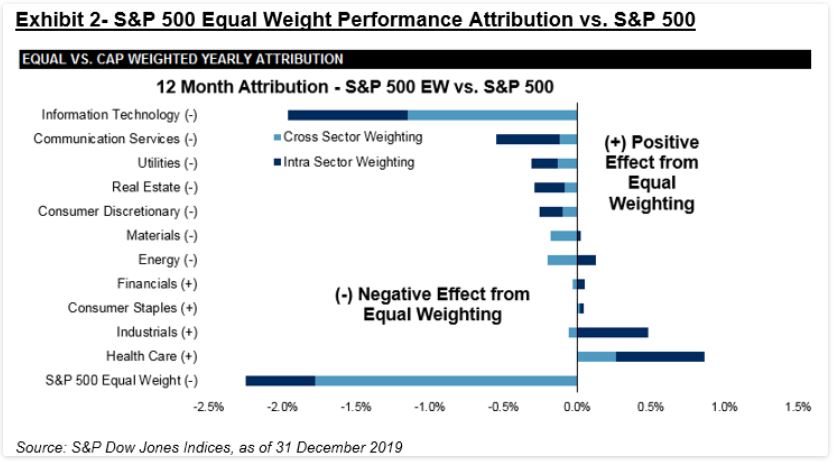 The performance of equal-weight indices provides an easy way to analyse the importance of size in stock and sector selection. S&P 500 Equal Weight Index has the same constituents as the S&P 500, but weights each constituent equally, with the result that the sector allocations are also more balanced. As illustrated in the latest S&P Equal Weight Sectors Dashboard, both underweighting the largest sectors and weighting equally within each sector helped to contribute to the 2.3% underperformance of the S&P 500 Equal Weight index in 2019. In fact, sector allocations were responsible for the lion’s share of underperformance – with an underweight in the tech sector accounting for over 1% of the drag.