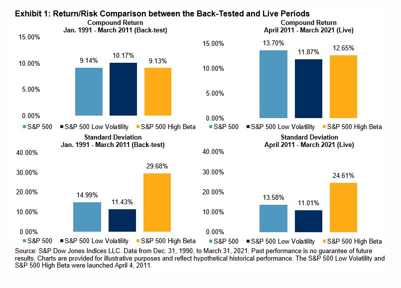 On April 4, 2011, S&P DJI launched two strategy indices, the S&P 500® Low Volatility Index and the S&P 500 High Beta Index. Ten years of live history let us compare how the two indices actually performed versus their pre-launch back-tests.