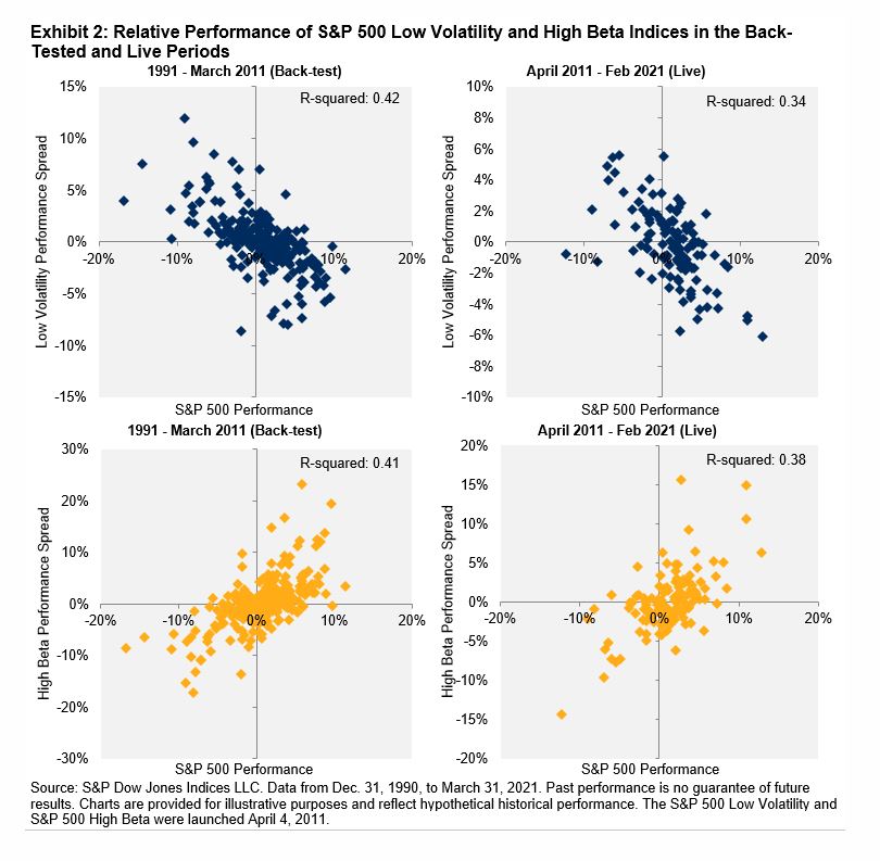 In the back-tested period from 1991 through March 2011, Low Volatility outperformed the benchmark S&P 500 with lower risk, while High Beta underperformed with higher risk. In the live period, Low Volatility underperformed while maintaining its goal of lowering volatility. High Beta’s live relative performance and risk were both comparable to those of the back-tested period.