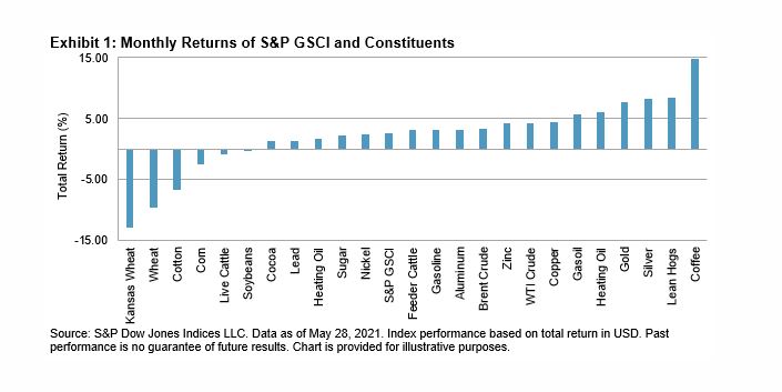 It was a good month for precious metals. The S&P GSCI Precious Metals rallied 7.7%, as market participants switched their focus back to the risk of inflation and the U.S. dollar fell. The S&P GSCI Gold hit a near five-month high at the end of May, benefiting from a rebound in demand for jewelry, bars, and coins in China.