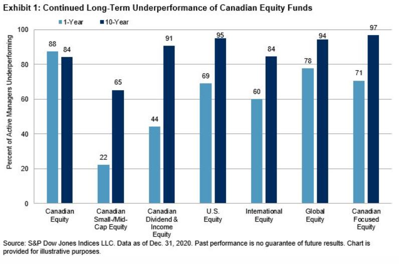 The data from the SPIVA Canada Year-End 2020 Scorecard show disappointing performance of active funds relative to their respective benchmarks. Over the past decade, most funds in all categories failed to beat index investing.