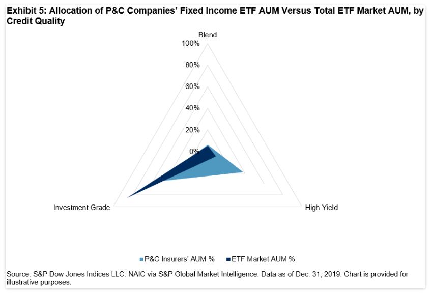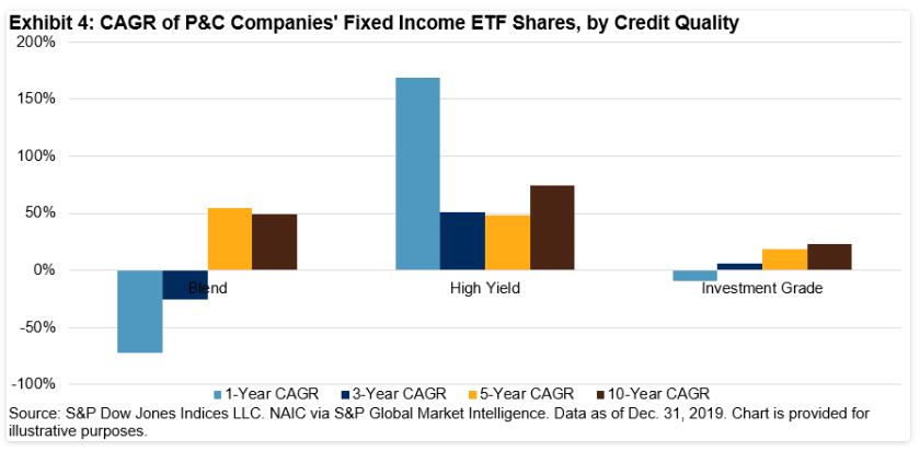 Fixed income ETF usage within insurance general accounts overall, however, continues to grow, with AUM up 13% year-over-year and shares up 11% year-over-year. While nearly 80% of insurers’ fixed income ETF AUM was in investment-grade bond ETFs, HY bond ETFs are gaining traction, particularly with P&C insurers, which increased their buying of HY bond ETFs by 169% in 2019 (see Exhibit 4).