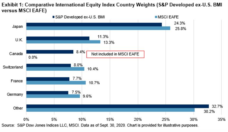 Exhibit 1 depicts the country composition of MSCI EAFE compared to the S&P Developed ex-U.S. BMI, which includes all developed markets excluding the U.S. With an 8.4% weight, Canada was the third largest market out of the 24 countries included in the S&P Developed ex-US BMI as of Sept. 30, 2020.
