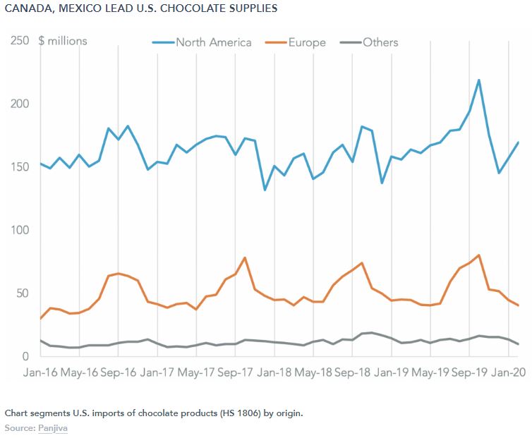 Yet, that doesn’t mean that retailers are expecting a collapse in demand. Indeed, Panjiva’s data shows that U.S. imports of chocolate products 1.3% rise in January and February combined, while preliminary data for March shows seaborne imports slipped 4.6% lower. Imports from Canada and Mexico have done better than those from Europe, possibly reflecting a switch to domestic brands over more luxurious imports from overseas.