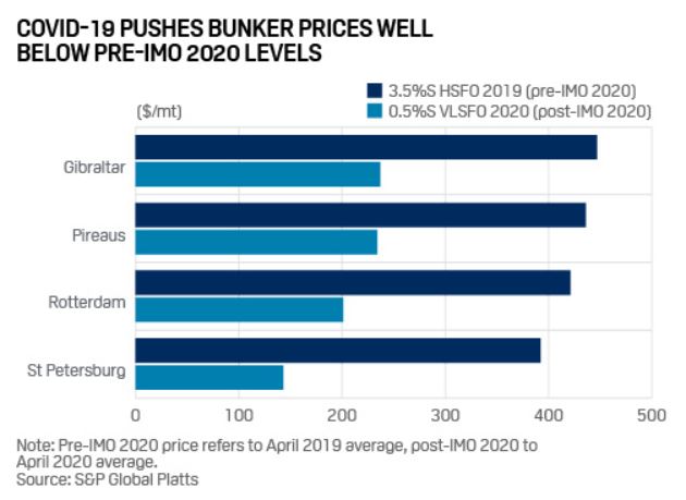 The marine fuel of choice for many shipowners, was very low sulfur fuel oil (0.5% sulfur). Its price averaged $201/mt in April on a delivered basis at Rotterdam, half what it was before IMO 2020, despite the main fuel one year ago containing more sulfur.